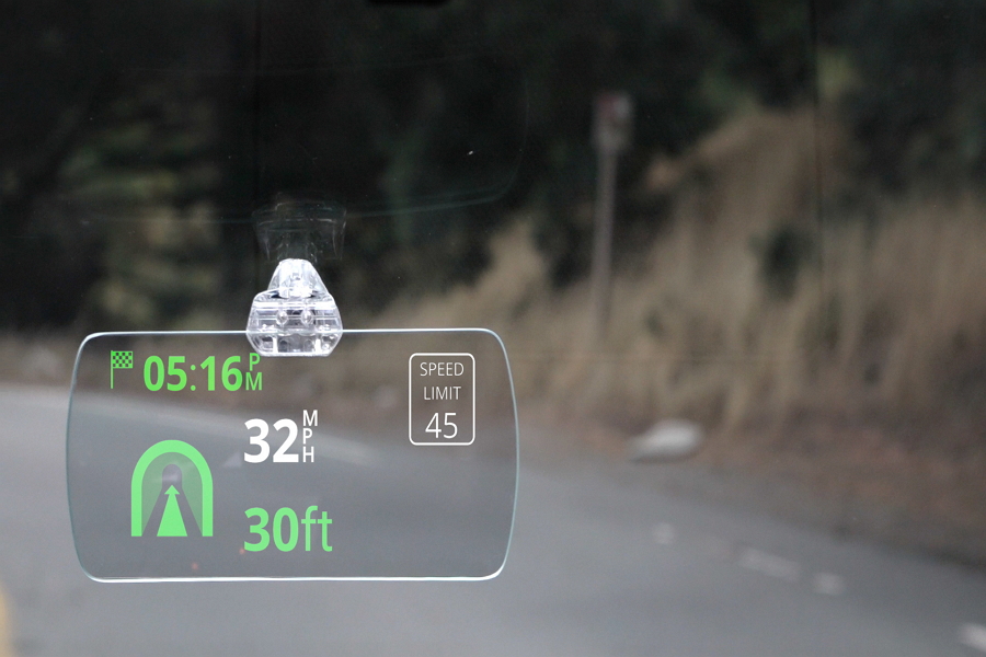 One cool feature of Hudly is that the information on the display is visible in any lighting condition. The projector has a built-in light sensor that detects how much ambient light there is and will adjust the brightness of the Hudly display. The display will work in very bright sunlight and will not be distracting when used at night.